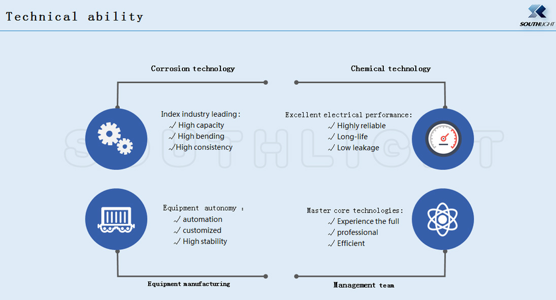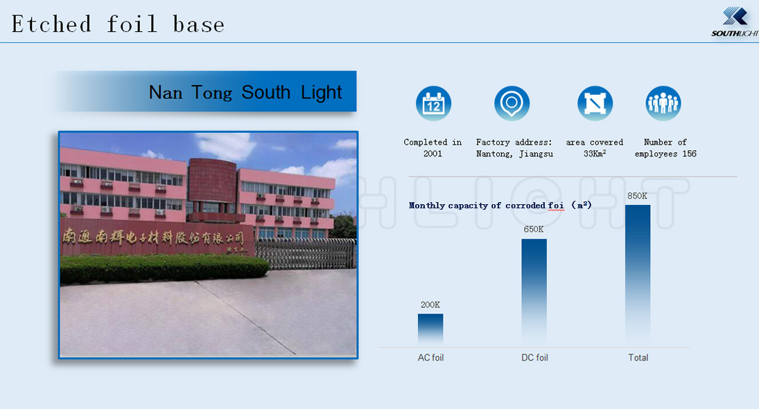 Nantong South Light Electronic Material Co., Ltd. (“South Light”) is founded in 2001 and located at Nantong Economic & Technological Development Area, Jiangsu Province. With registered capital of RMB84 million, South Light is a national high-tech enterprise specialized in R&D, production and sales of electrode foil for high-performance aluminum electrolytic capacitors. As one of China Top 100 Electronic Component Enterprises and a leading company in the electrode foil industry, South Light focuses on the future, keeps making innovation, makes progress ambitiously, integrates high-quality resources ceaselessly, deploys advanced equipment, and builds a core team of its own members. It relies on “One Workstation, One Center” to promote the Industry-University-Institute Collaboration. To carry out R&D activities effectively, the Company has established a postdoctoral workstation and an engineering technology R&D center. It possesses a specialized R&D team with abundant experiences and strong independent R&D capacity. Recognized as Nantong Municipal Technological Center, the Company has successfully developed a dozen of new technologies for production of electrode foil, gained 5 invention patents and 10 utility model patents, and applied for 3 pending invention patents and 10 pending utility model patents. How to remain invincible in the fierce market competition is a major issue faced by every enterprise. South Light has advanced manufacturing technologies and process controls. Its products conform to the requirements of EU RoHS Directive. Its high-voltage and high CV electrode foil and low-leakage and medium and high voltage formed foilhave been recognized by the Science and Technology Department of Jiangsu Province as the high-tech products of Jiangsu Province. Meanwhile, the electrode foil for motor running capacitors fills up the domestic blank. The product performance reaches the international advanced level. While supplying goods to the aluminum electrolytic capacitor manufacturers well known in China, the Company also exports its products to USA, UK, Germany, Portugal, Mexico, Japan, Korea, and other countries and regions, and gain extensive popularity with customers. At present, the Company mainly focuses on medium/high voltage electrolytic foil with high technical content and high added value; it possesses a complete series of high-performance medium/high voltage etched foil and formed foil, and makes products of special specifications to satisfy the customers’ different demands. Moreover, South Light makes uninterrupted efforts through technological R&D and technical innovation to push forward the urban sustainable development and environmental protection. In order to make our lives greener, the Company utilizes the waste acid generated in the electrolytic foil industry and the high-voltage electrolytic foil etching process as resources by separating aluminum ions from the mixture of sulphuric acid and hydrochloric acid containing aluminum ions through the processes such as evaporation and concentration, cooling crystallization, and centrifugal separation. Such resources are turned into aluminum sulfate that may be sold directly as products. In this way, the Company recycles all recovered acids and liquids concentrated after evaporation to the production lines, thus realizing full utilization of waste acid as resources. This technology is achieved solely by physical methods without using any additive. It not only recycles all waste acid and realizes zero release of waste acid, but also gains certain income from waste acid control.